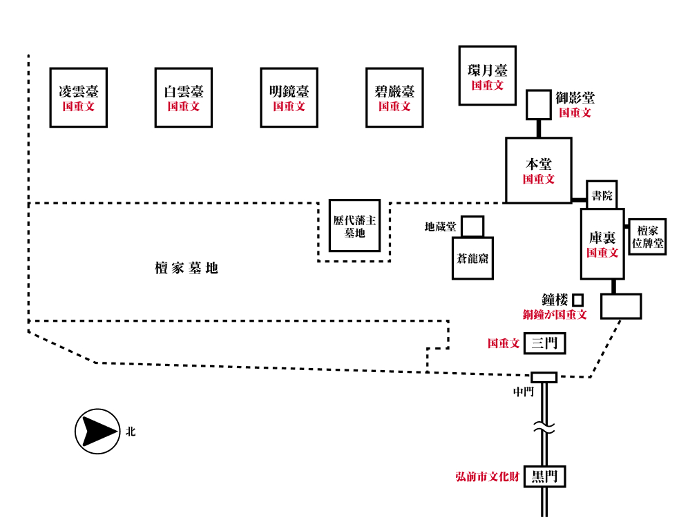 長勝寺境内には以下の通り国の重要文化財があります。・本堂 ・庫裏 ・三門 ・御影堂 ・津軽家霊屋(環月臺、碧巌臺、明鏡臺、白雲臺、凌雲臺)・銅鐘